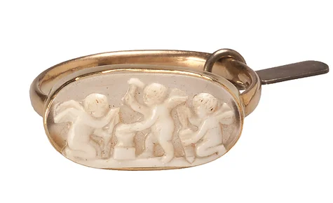 Signet rings, used as a personal signature, continued to be used by the Greeks and Romans. It is said that the signet inspired some of the earliest known betrothal rings in Rome. Yes, in Egypt they exchanged rings as gifts of devotion, then in Greece they gave rings to lovers featuring Eros the god of love or his cherubs. But it is believed that it was the Romans who linked the ring to marriage. Most commonly with a "fede" ring, depicting two hands clasping in love or agreement/ dextrarum iunctio. These designs could be made in solid gold or carved in stone, like a signet, often in cornelian, aquamarine, garnet, or onyx.