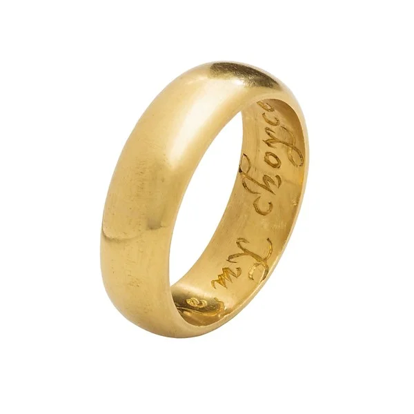 A posy (or posie) is a short verse, often from a poem, inscribed on a ring. Posy rings were first commonly worn in the 15th century. In their beginning they had bold designs and were inscribed with words on the outside of the bands. As time went on the designs of the bands became simpler, but the inscriptions became more personal. This forced goldsmiths to advance their techniques and learn to engrave on the inside of the rings to keep these messages private and close to the wearer they. This shows a shift, from marriage often being an agreement between families when an ornate ring signified a more profitable arrangement. To marriages founded in love, with simple rings formed from gold coins, bearing inscriptions like “Love me and leave me not” and “Two bodies, one heart.”